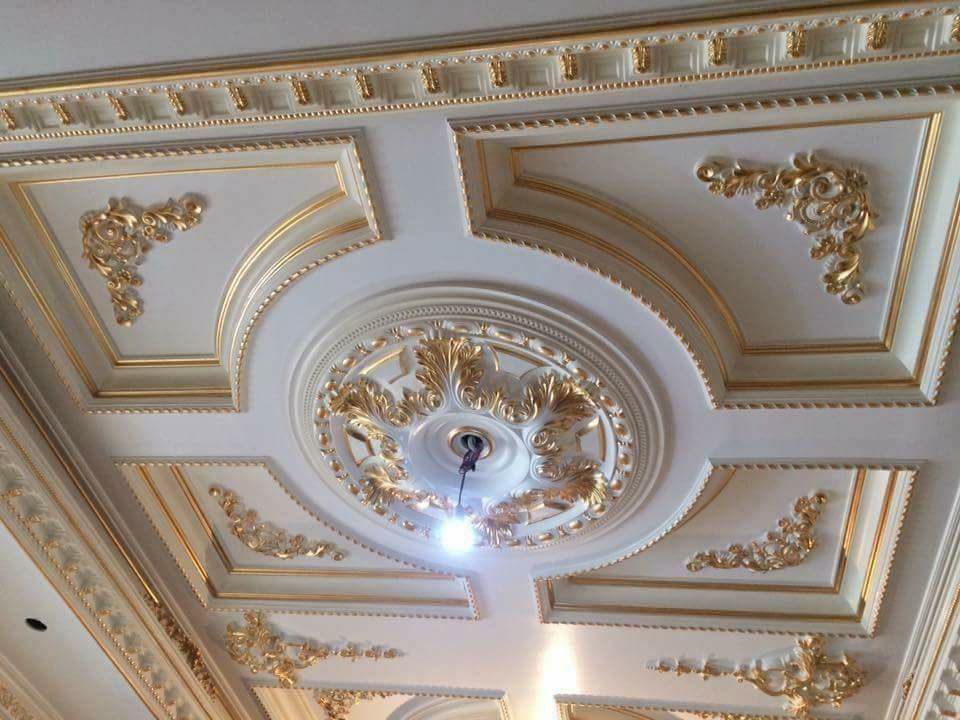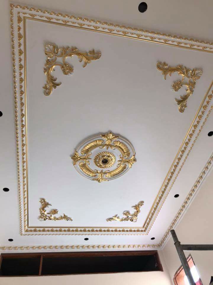 Phào cổ trần: hoa văn phào cổ trần khá đa dạng mẫu mã và kích thước. Với các trần thấp, không nên dùng phào cổ trần quá 15cm. Với biệt thự có chiều cao lớn, các phào cổ trần có loại tới 20-22cm làm thành 2 cấp